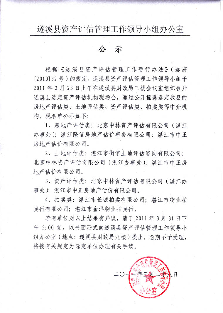 遂溪縣房地產(chǎn)、土地、資產(chǎn)評估類及拍賣類等中介機(jī)構(gòu)名單公示 | | 作者:遂溪縣資產(chǎn)評估管理工作領(lǐng)導(dǎo)小組辦公室 | 來源:遂溪縣資產(chǎn)評估管理工作領(lǐng)導(dǎo)小組辦公室 | 時間:2011-03-28 09:28:00 點(diǎn)擊數(shù):- ? 【打印正文】