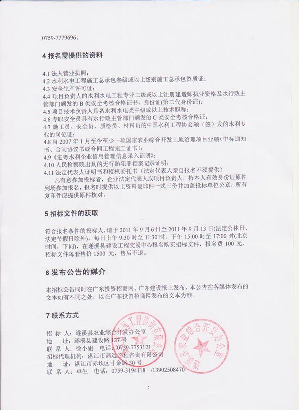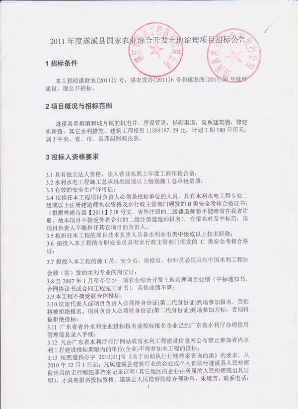2011年度遂溪縣國家農(nóng)業(yè)綜合開發(fā)土地治理項目招標(biāo)公告 | | 作者:遂溪縣建設(shè)工程交易中心 | 來源:遂溪縣建設(shè)工程交易中心 | 時間:2011-09-06 09:15:26 點擊數(shù):- 【打印正文】