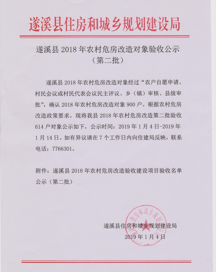 遂溪縣2018年農(nóng)村危房改造驗(yàn)收建設(shè)項(xiàng)目驗(yàn)收名單公示(第二批) | | 作者:縣住建局 | 來(lái)源:縣住建局 | 時(shí)間:2019-01-04 11:40:15 點(diǎn)擊數(shù):- 遂溪縣2018年農(nóng)村危房改造驗(yàn)收建設(shè)項(xiàng)目驗(yàn)收名單公示(第二批).xlsx 【打印正文】