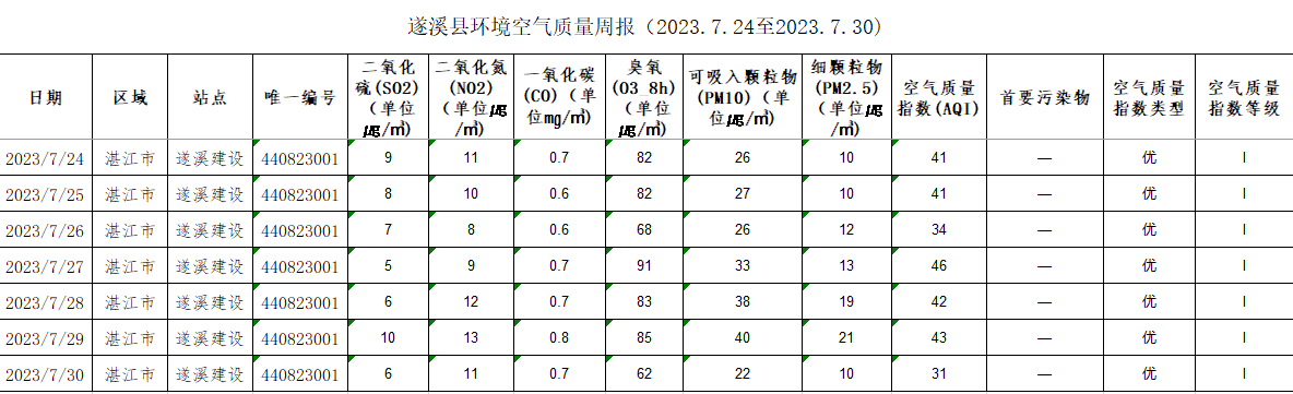 遂溪縣環(huán)境空氣質(zhì)量周報(2023.7.24至2023.7.30) | | 作者: | 來源:湛江市生態(tài)環(huán)境局遂溪分局 | 時間:2023-07-31 09:35:52 點擊數(shù):- 【打印正文】