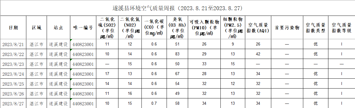 遂溪縣環(huán)境空氣質(zhì)量周報(bào)(2023.8.21至2023.8.27) | | 作者: | 來源:湛江市生態(tài)環(huán)境局遂溪分局 | 時間:2023-08-28 09:37:45 點(diǎn)擊數(shù):- 【打印正文】