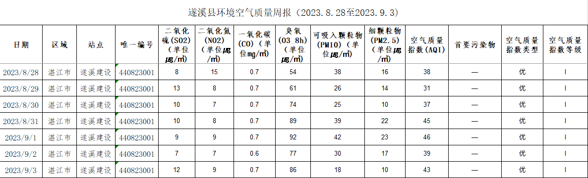 遂溪縣環(huán)境空氣質(zhì)量周報(bào)(2023.8.28至2023.9.3) | | 作者: | 來(lái)源:湛江市生態(tài)環(huán)境局遂溪分局 | 時(shí)間:2023-09-04 09:39:24 點(diǎn)擊數(shù):- 【打印正文】