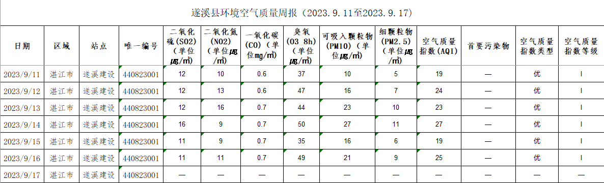遂溪縣環(huán)境空氣質(zhì)量周報(2023.9.11至2023.9.17) | | 作者: | 來源:湛江市生態(tài)環(huán)境局遂溪分局 | 時間:2023-09-18 10:12:46 點擊數(shù):- 【打印正文】