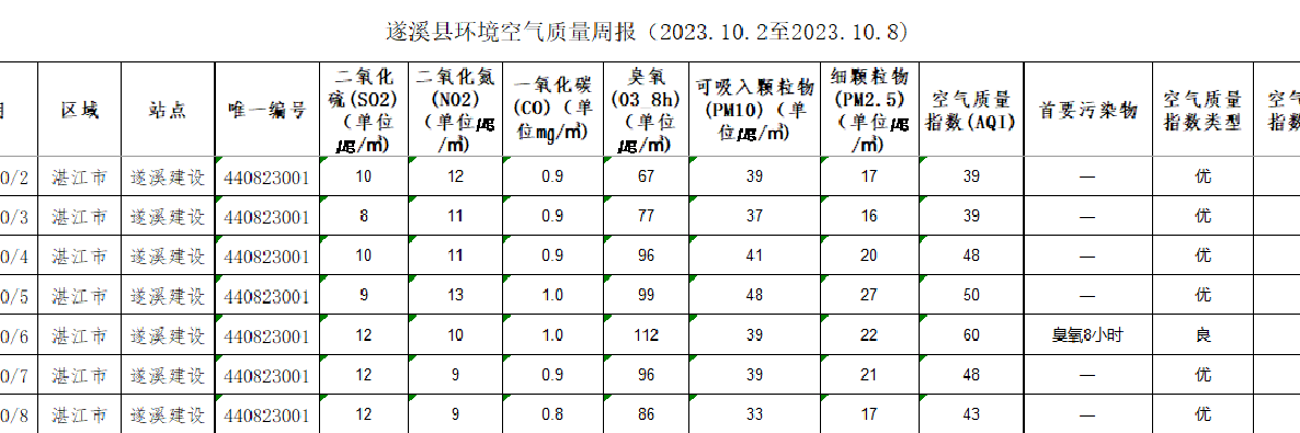 遂溪縣環(huán)境空氣質(zhì)量周報(bào)(2023.10.02至2023.10.08) | | 作者: | 來源:湛江市生態(tài)環(huán)境局遂溪分局 | 時(shí)間:2023-10-11 11:37:57 點(diǎn)擊數(shù):- 【打印正文】