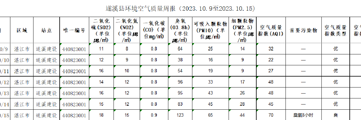 遂溪縣環(huán)境空氣質(zhì)量周報(bào)(2023.10.09至2023.10.15) | | 作者: | 來(lái)源:湛江市生態(tài)環(huán)境局遂溪分局 | 時(shí)間:2023-10-16 09:46:43 點(diǎn)擊數(shù):- 【打印正文】