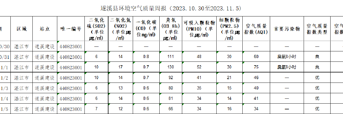 遂溪縣環(huán)境空氣質(zhì)量周報(bào)(2023.10.30至2023.11.05) | | 作者: | 來源:湛江市生態(tài)環(huán)境局遂溪分局 | 時(shí)間:2023-11-06 09:26:34 點(diǎn)擊數(shù):- 【打印正文】