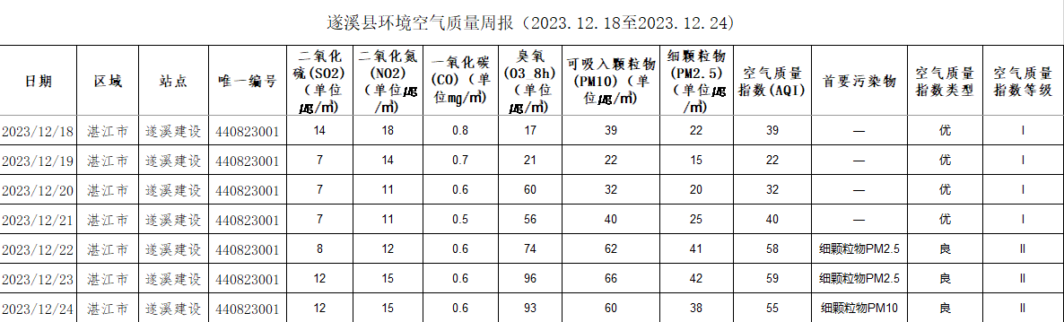 遂溪縣環(huán)境空氣質(zhì)量周報(bào)(2023.12.18至2023.12.24) | | 作者: | 來源:湛江市生態(tài)環(huán)境局遂溪分局 | 時(shí)間:2023-12-25 14:46:13 點(diǎn)擊數(shù):- 【打印正文】