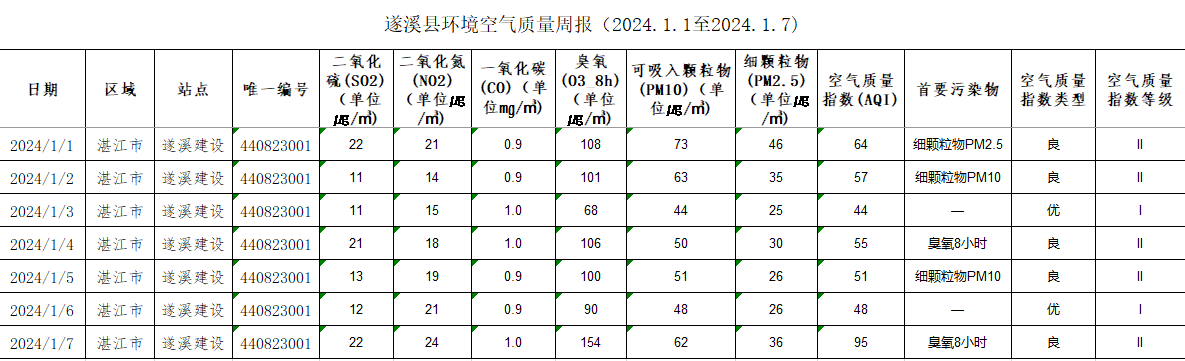 遂溪縣環(huán)境空氣質(zhì)量周報(bào)(2024.1.1至2024.1.7) | | 作者: | 來源:湛江市生態(tài)環(huán)境局遂溪分局 | 時(shí)間:2024-01-10 09:34:01 點(diǎn)擊數(shù):- 【打印正文】