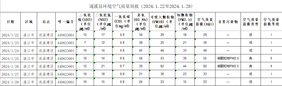 遂溪縣環(huán)境空氣質(zhì)量周報(2024.1.22至2024.1.28) | | 作者: | 來源:湛江市生態(tài)環(huán)境局遂溪分局 | 時間:2024-01-29 10:58:41 點擊數(shù):- 【打印正文】