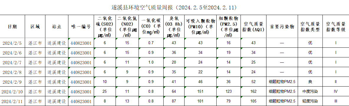 遂溪縣環(huán)境空氣質(zhì)量周報(bào)(2024.2.5至2024.2.11) | | 作者: | 來(lái)源:湛江市生態(tài)環(huán)境局遂溪分局 | 時(shí)間:2024-02-12 11:00:57 點(diǎn)擊數(shù):- 【打印正文】