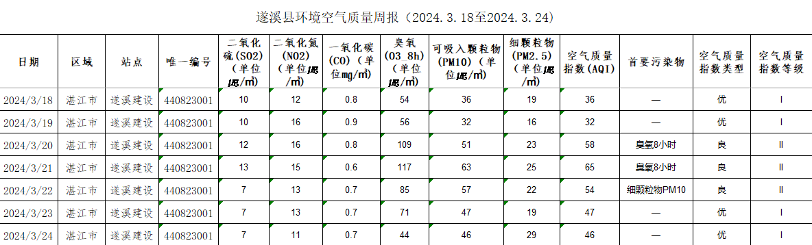 遂溪縣環(huán)境空氣質(zhì)量周報(2024.3.18至2024.3.24) | | 作者: | 來源:湛江市生態(tài)環(huán)境局遂溪分局 | 時間:2024-03-25 14:50:01 點擊數(shù):- 【打印正文】