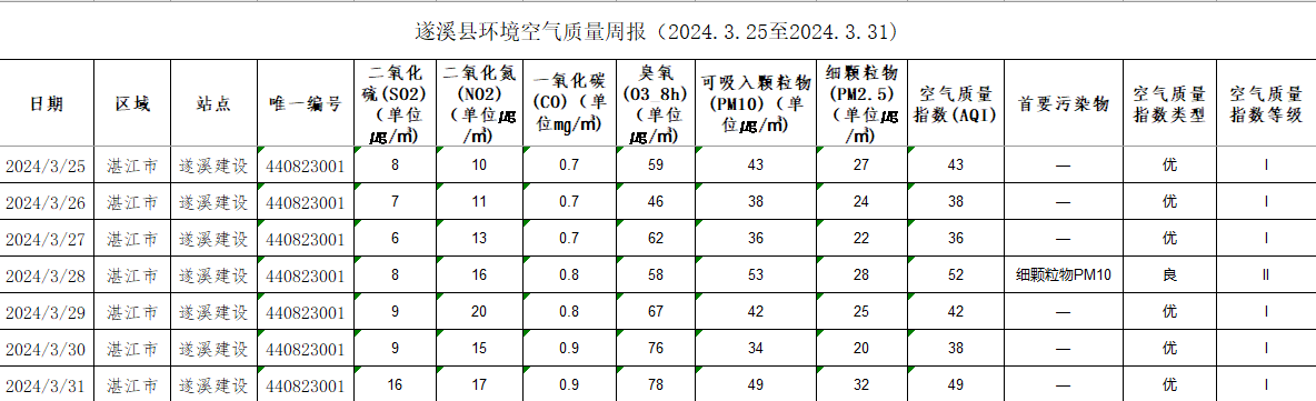 遂溪縣環(huán)境空氣質(zhì)量周報(2024.3.25至2024.3.31) | | 作者: | 來源:湛江市生態(tài)環(huán)境局遂溪分局 | 時間:2024-04-01 09:39:48 點擊數(shù):- 【打印正文】