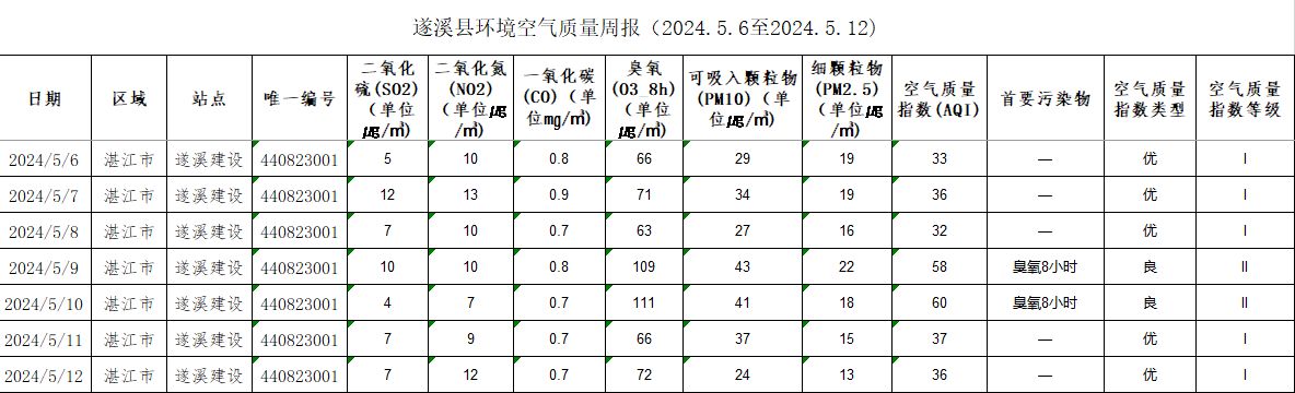 遂溪縣環(huán)境空氣質(zhì)量周報(bào)(2024.5.06至2024.5.12) | | 作者: | 來源:湛江市生態(tài)環(huán)境局遂溪分局 | 時(shí)間:2024-05-14 09:12:11 點(diǎn)擊數(shù):- 【打印正文】