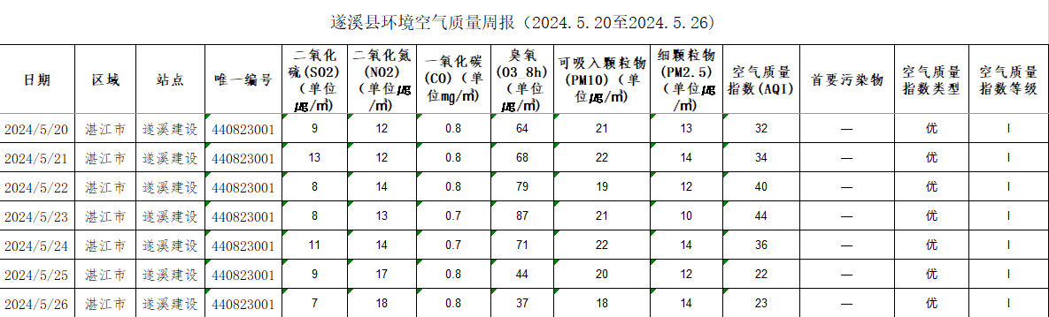 遂溪縣環(huán)境空氣質量周報(2024.5.20至2024.5.26) | | 作者: | 來源:湛江市生態(tài)環(huán)境局遂溪分局 | 時間:2024-05-27 12:17:43 點擊數(shù):- 【打印正文】