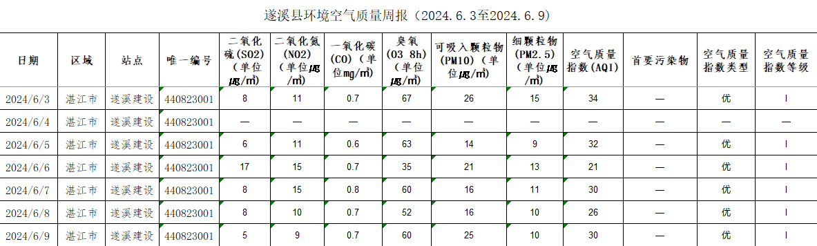 遂溪縣環(huán)境空氣質(zhì)量周報(2024.6.03至2024.6.09) | | 作者: | 來源:湛江市生態(tài)環(huán)境局遂溪分局 | 時間:2024-06-10 08:41:25 點擊數(shù):- 【打印正文】
