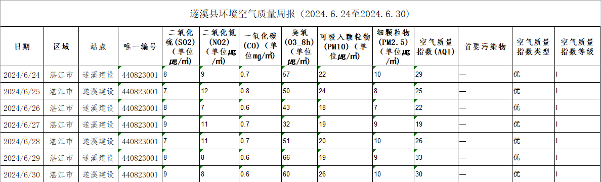 遂溪縣環(huán)境空氣質(zhì)量周報(bào)(2024.6.24至2024.6.30) | | 作者: | 來源:湛江市生態(tài)環(huán)境局遂溪分局 | 時(shí)間:2024-07-02 10:48:18 點(diǎn)擊數(shù):- 【打印正文】