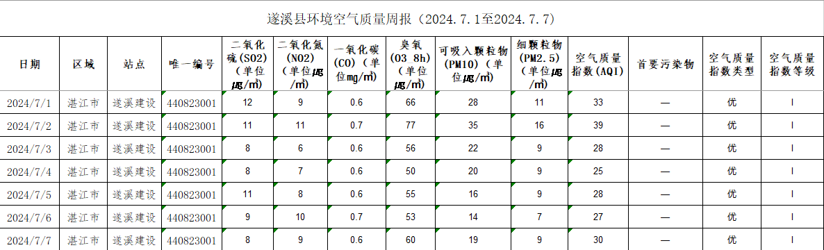 遂溪縣環(huán)境空氣質(zhì)量周報(bào)(2024.7.01至2024.7.07) | | 作者: | 來(lái)源:湛江市生態(tài)環(huán)境局遂溪分局 | 時(shí)間:2024-07-02 10:45:12 點(diǎn)擊數(shù):- 【打印正文】