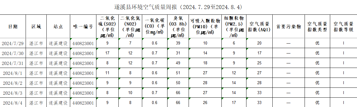 遂溪縣環(huán)境空氣質(zhì)量周報(2024.7.29至2024.8.4) | | 作者: | 來源:湛江市生態(tài)環(huán)境局遂溪分局 | 時間:2024-08-09 11:08:02 點(diǎn)擊數(shù):- 【打印正文】