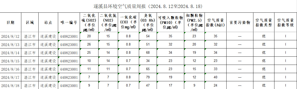 遂溪縣環(huán)境空氣質(zhì)量周報(bào)(2024.8.11至2024.8.18) | | 作者: | 來源:湛江市生態(tài)環(huán)境局遂溪分局 | 時(shí)間:2024-08-19 09:59:00 點(diǎn)擊數(shù):- 【打印正文】