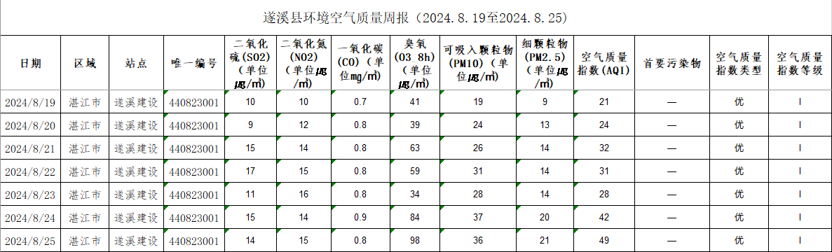 遂溪縣環(huán)境空氣質(zhì)量周報(bào)(2024.8.19至2024.8.25) | | 作者: | 來(lái)源:湛江市生態(tài)環(huán)境局遂溪分局 | 時(shí)間:2024-08-26 09:59:54 點(diǎn)擊數(shù):- 【打印正文】