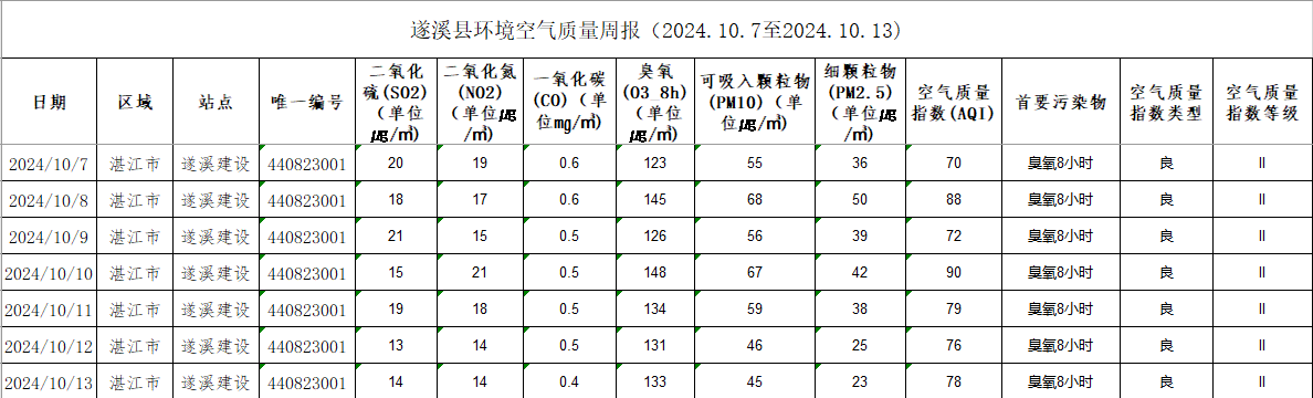 遂溪縣環(huán)境空氣質(zhì)量周報(2024.10.7至2024.10.13) | | 作者: | 來源:湛江市生態(tài)環(huán)境局遂溪分局 | 時間:2024-10-14 08:56:56 點擊數(shù):- 【打印正文】