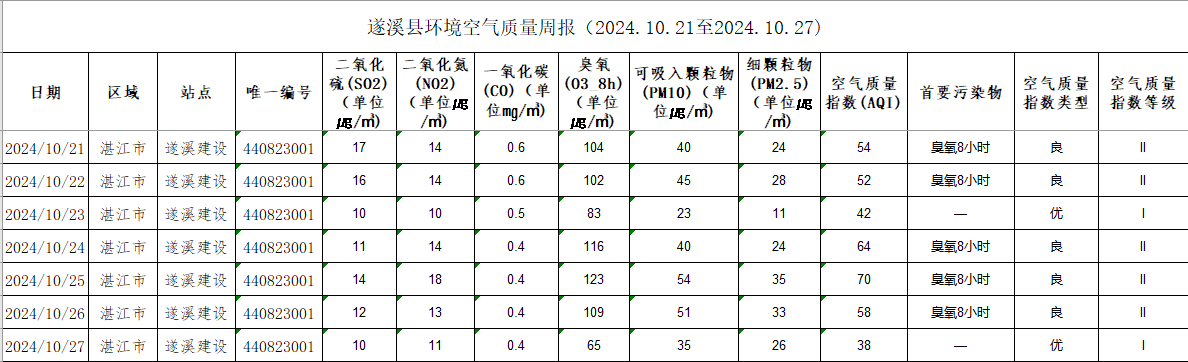遂溪縣環(huán)境空氣質(zhì)量周報(2024.10.21至2024.10.27) | | 作者: | 來源:湛江市生態(tài)環(huán)境局遂溪分局 | 時間:2024-10-28 09:15:33 點擊數(shù):- 【打印正文】