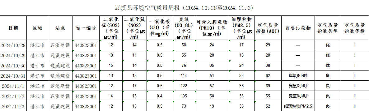 遂溪縣環(huán)境空氣質量周報(2024.10.28至2024.11.03) | | 作者: | 來源:湛江市生態(tài)環(huán)境局遂溪分局 | 時間:2024-11-04 09:16:34 點擊數(shù):- 【打印正文】