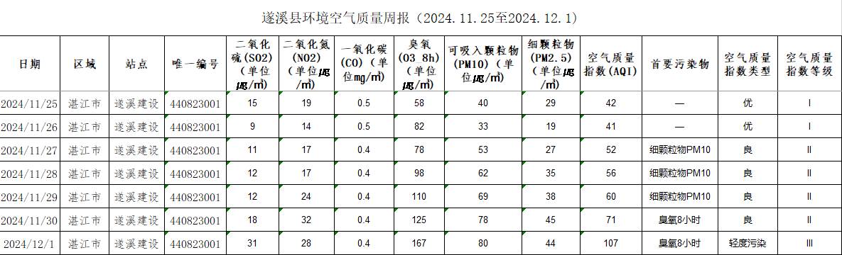 遂溪縣環(huán)境空氣質(zhì)量周報(bào)(2024.11.25至2024.12.01) | | 作者: | 來(lái)源:湛江市生態(tài)環(huán)境局遂溪分局 | 時(shí)間:2024-12-04 10:05:07 點(diǎn)擊數(shù):- 【打印正文】
