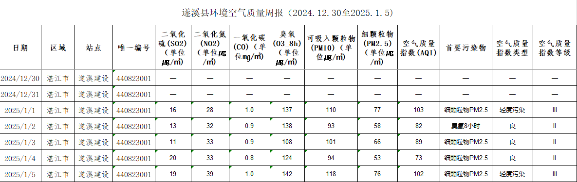 遂溪縣環(huán)境空氣質(zhì)量周報(2024.12.30至2025.1.05) | | 作者: | 來源:湛江市生態(tài)環(huán)境局遂溪分局 | 時間:2025-01-07 15:09:01 點擊數(shù):- 【打印正文】