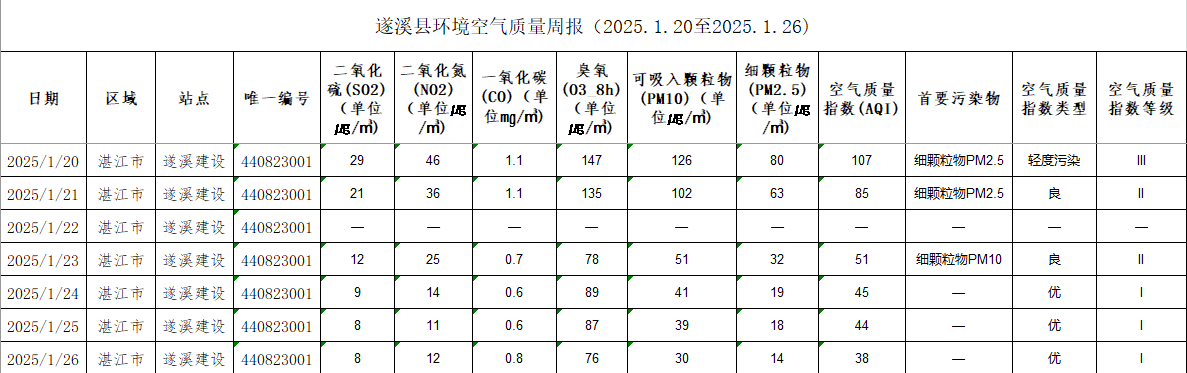 遂溪縣環(huán)境空氣質(zhì)量周報(bào)(2025.1.20至2025.1.26) | | 作者: | 來(lái)源:湛江市生態(tài)環(huán)境局遂溪分局 | 時(shí)間:2025-01-27 10:57:17 點(diǎn)擊數(shù):- 【打印正文】