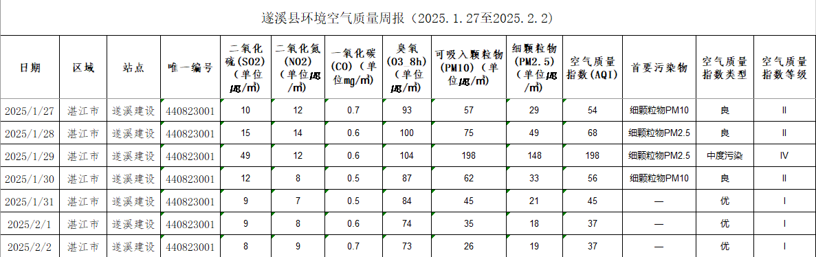 遂溪縣環(huán)境空氣質(zhì)量周報(2025.1.27至2025.2.2) | | 作者: | 來源:湛江市生態(tài)環(huán)境局遂溪分局 | 時間:2025-02-05 10:58:43 點擊數(shù):- 【打印正文】