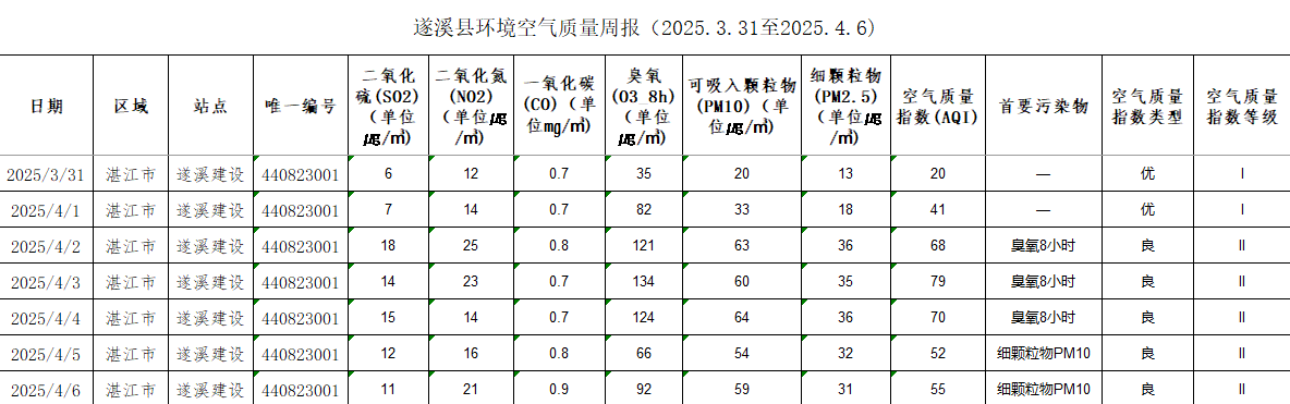 遂溪縣環(huán)境空氣質(zhì)量周報(2025.3.31至2025.4.6) | | 作者: | 來源:湛江市生態(tài)環(huán)境局遂溪分局 | 時間:2025-04-10 11:02:42 點擊數(shù):- 【打印正文】