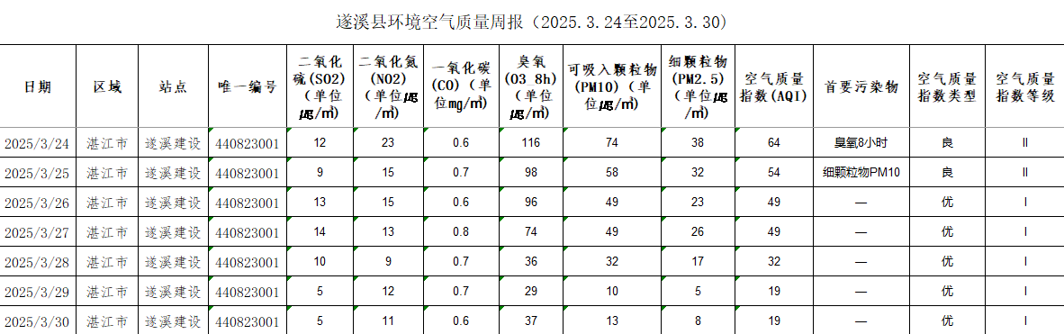 遂溪縣環(huán)境空氣質量周報(2025.3.24至2025.3.30) | | 作者: | 來源:湛江市生態(tài)環(huán)境局遂溪分局 | 時間:2025-03-31 11:06:32 點擊數(shù):- 【打印正文】