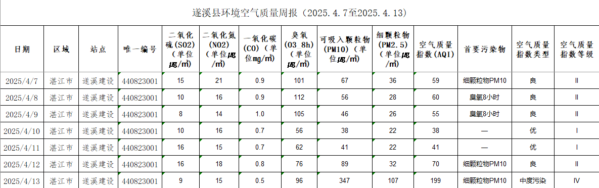 遂溪縣環(huán)境空氣質(zhì)量周報(bào)(2025.4.7至2025.4.13) | | 作者: | 來源:湛江市生態(tài)環(huán)境局遂溪分局 | 時(shí)間:2025-04-14 09:00:07 點(diǎn)擊數(shù):- 【打印正文】