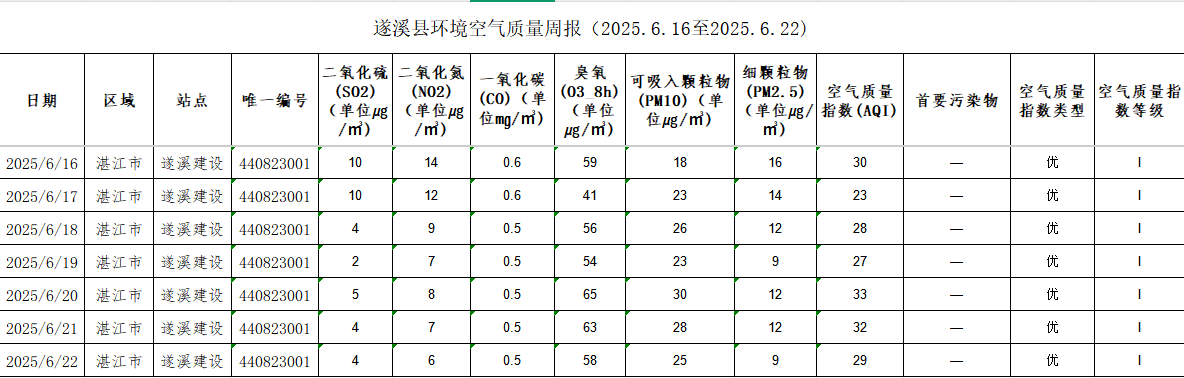 遂溪縣環(huán)境空氣質(zhì)量周報(bào)(2025.6.16至2025.6.22) | | 作者: | 來(lái)源:湛江市生態(tài)環(huán)境局遂溪分局 | 時(shí)間:2025-06-23 09:34:29 點(diǎn)擊數(shù):- 【打印正文】