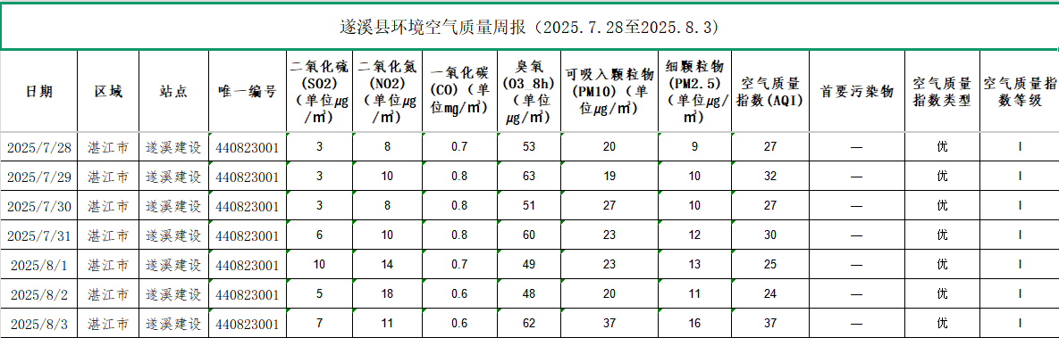 遂溪縣環(huán)境空氣質(zhì)量周報(bào)(2025.7.28至2025.8.3) | | 作者: | 來源:湛江市生態(tài)環(huán)境局遂溪分局 | 時間:2025-08-04 09:52:48 點(diǎn)擊數(shù):- 【打印正文】