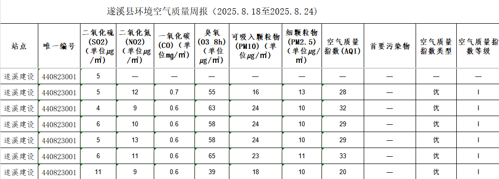 遂溪縣環(huán)境空氣質(zhì)量周報(2025.8.18至2025.8.24) | | 作者: | 來源:湛江市生態(tài)環(huán)境局遂溪分局 | 時間:2025-08-25 09:14:58 點擊數(shù):- 【打印正文】