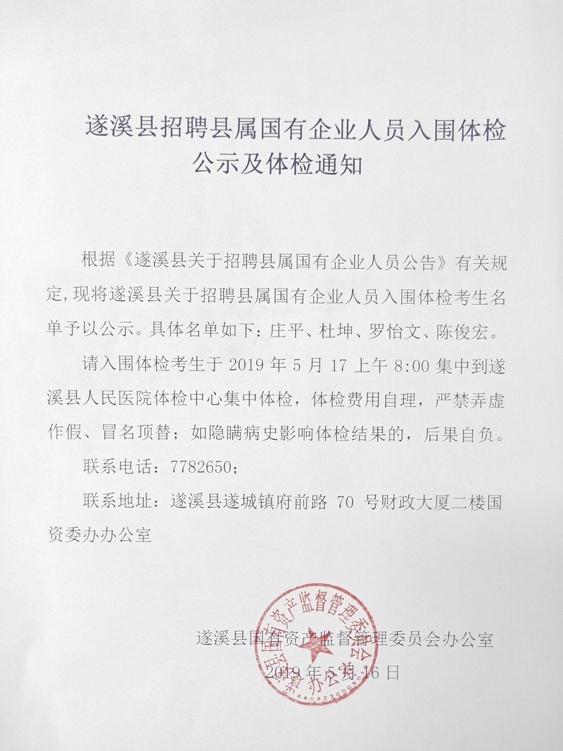 遂溪縣招聘縣屬國(guó)有企業(yè)人員入圍體檢及體檢通知. | | 作者: | 來(lái)源:本網(wǎng) | 時(shí)間:2019-05-17 00:00:00 點(diǎn)擊數(shù):- 【打印正文】