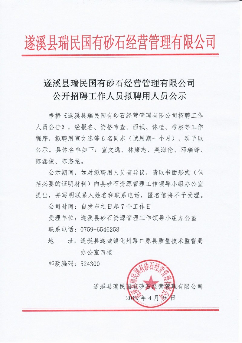 遂溪縣瑞民國有砂石經(jīng)營管理有限公司公開招聘工作人員擬聘用人員公示 | | 作者: | 來源:本網(wǎng) | 時間:2019-04-28 00:00:00 點擊數(shù):- 【打印正文】
