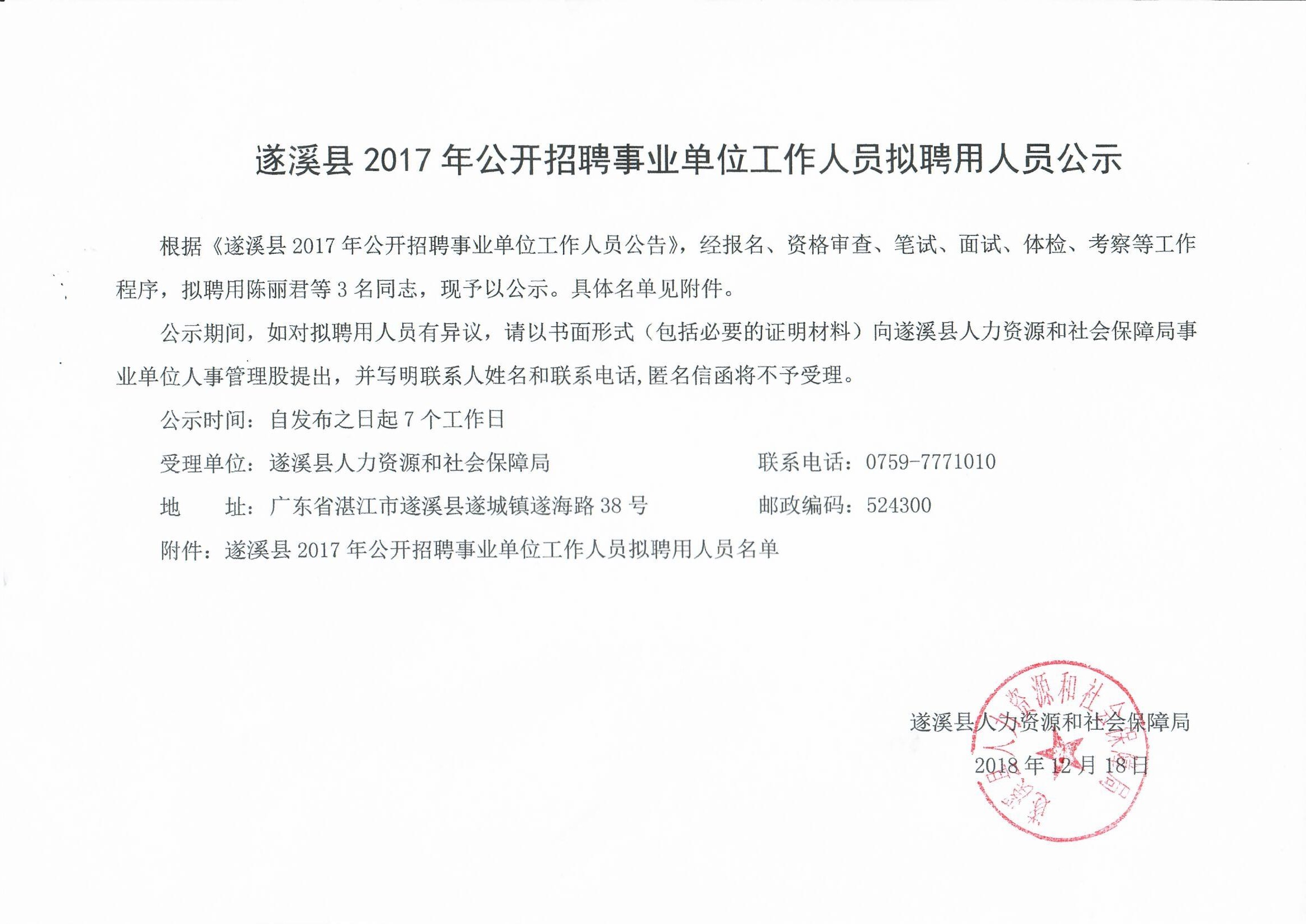 遂溪縣2017年公開招聘事業(yè)單位工作人員擬聘用人員公示