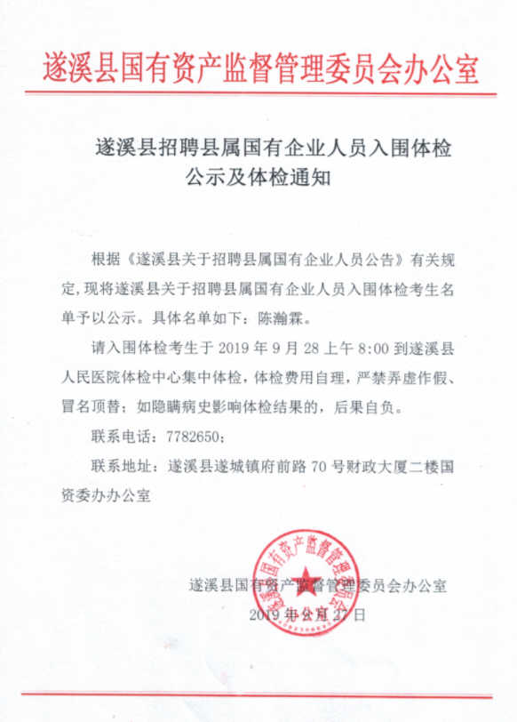 遂溪縣關(guān)于招聘縣屬國有企業(yè)人員入圍體檢公示