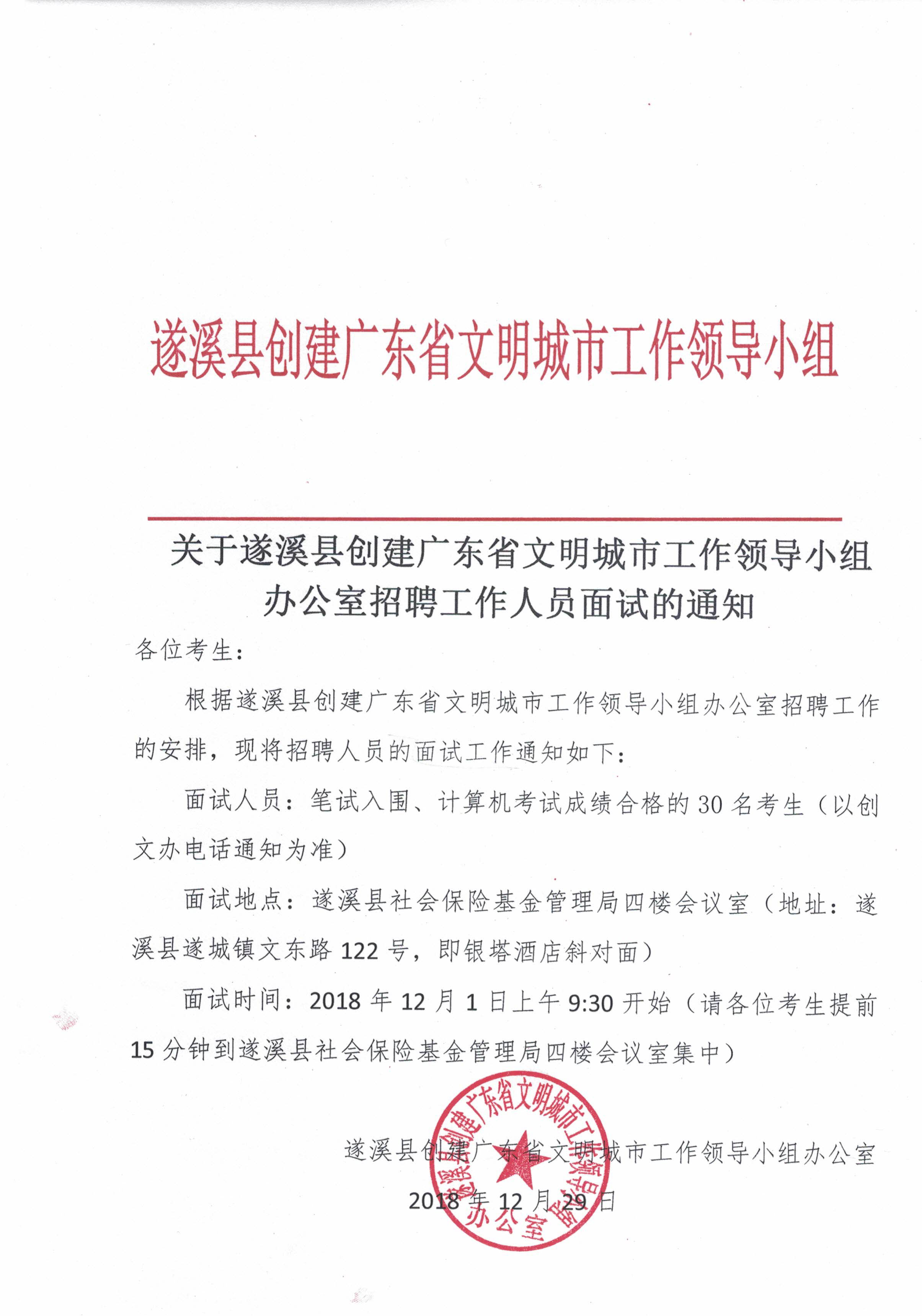 關(guān)于遂溪縣創(chuàng)建廣東省文明城市工作領(lǐng)導(dǎo)小組辦公室招聘工作人員面試的通知 | | 作者: | 來源:本網(wǎng) | 時間:2018-11-29 16:22:00 點(diǎn)擊數(shù):- 遂溪縣創(chuàng)建廣東省文明城市工作領(lǐng)導(dǎo)小組辦公室招聘工作人員面試名單 【打印正文】