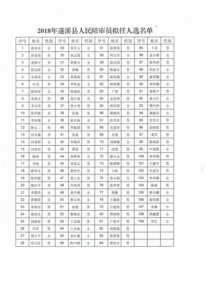 2018年遂溪縣人民陪審員擬任人選名單