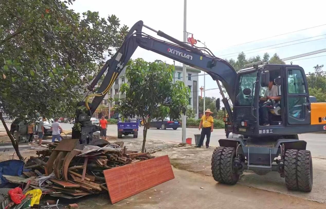 利用夾機(jī)清除住戶門前亂堆放的雜物