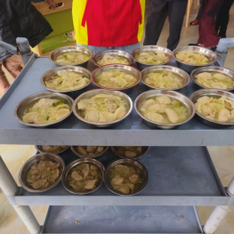 這邊餃子包得熱火朝天,另一邊煮餃子的工作人員也沒閑著,幾個蒸鍋同時蒸,很快熱氣騰騰的餃子就出鍋了,為了老人更好地品嘗,還貼心為老人準備了肉湯。