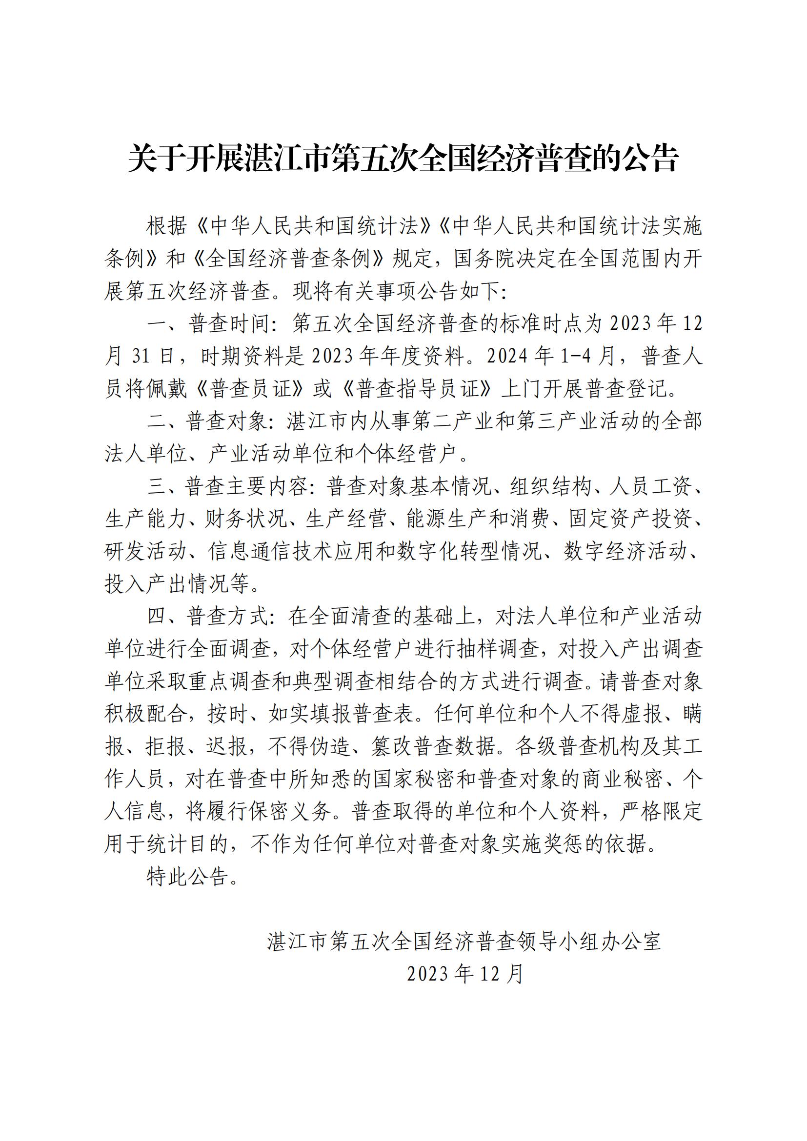 關(guān)于開展湛江市第五次全國(guó)經(jīng)濟(jì)普查的公告