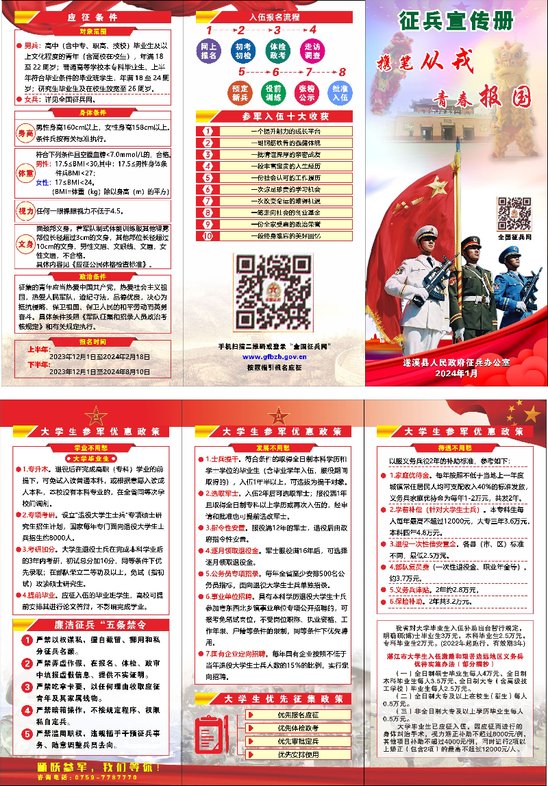 參軍入伍是一條出路,身著軍裝是一份職業(yè),衛(wèi)國戍邊是一份榮耀! 2024年上半年征兵已全面啟動,登陸全國征兵網(wǎng)(www.gfbzb.gov.cn)即可應征報名。詳情請咨詢湛江市征兵熱線:0759-3268160或關注公眾號:湛江國防教育了解。