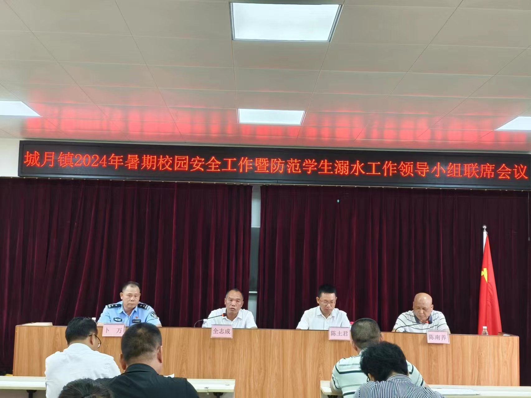 2024年7月8日,城月鎮(zhèn)2024年暑期校園安全工作暨防范學(xué)生防溺水工作領(lǐng)導(dǎo)小組聯(lián)席會議召開,城月鎮(zhèn)教育小組組長陳南養(yǎng)主持會議,鎮(zhèn)黨委委員、副鎮(zhèn)長全志成,黨委委員陳土君,城月交警中隊隊長卜萬,各小學(xué)校長、幼兒園園長參加會議。