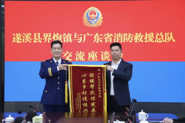 隨后,省消防救援總隊黨委委員、副總隊長袁奕之與梁李興書記一行召開座談會。會上,梁李興書記詳細(xì)介紹了駐鎮(zhèn)工作隊兩年來的工作成效、2023 年鎮(zhèn)經(jīng)濟和社會發(fā)展情況以及下一步的工作思路,并為總隊送上感謝信、錦旗。袁奕之副總隊長就助力界炮鎮(zhèn)鄉(xiāng)村振興工作和“百千萬”工程建設(shè)表示:一是總隊將堅決扛起政治責(zé)任,按照中央和省委省政府關(guān)于鄉(xiāng)村振興和高質(zhì)量發(fā)展的決策部署,一如既往地全力支持界炮鎮(zhèn)發(fā)展特色產(chǎn)業(yè), 提升人居環(huán)境品質(zhì)。二是持續(xù)深化“界炮農(nóng)產(chǎn)品走進火焰藍”消費幫扶活動,高標(biāo)準(zhǔn)推動“消防安全示范鎮(zhèn)”建設(shè),高品質(zhì)推動全省消防系統(tǒng)“1+l+N”結(jié)對幫扶行動。三是依托資源稟賦、生 態(tài)稟賦,全力配合界炮鎮(zhèn)把鄉(xiāng)村資源優(yōu)勢、生態(tài)優(yōu)勢、文化優(yōu)勢轉(zhuǎn)化為產(chǎn)品優(yōu)勢、產(chǎn)業(yè)優(yōu)勢,增強市場競爭力和可持續(xù)發(fā)展能力。