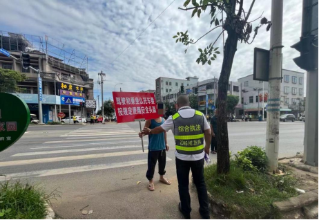 對(duì)違法行為人采取勸導(dǎo)、手舉交通安全宣傳標(biāo)語牌站崗20分鐘、現(xiàn)場(chǎng)向群眾發(fā)放道路交通安全宣傳資料。提高宣傳教育的實(shí)效性,營造濃厚的整治氛圍。